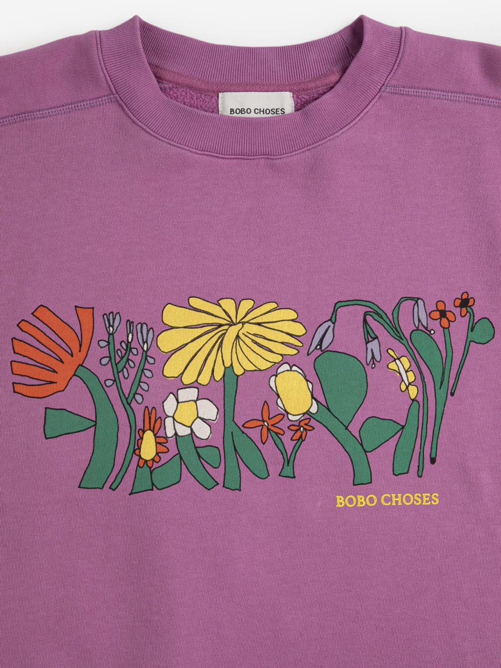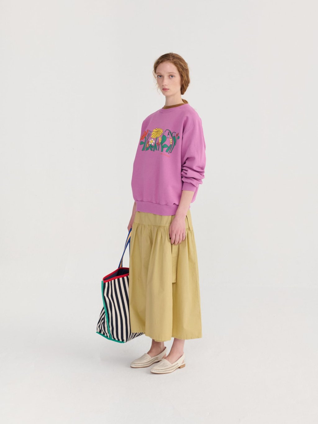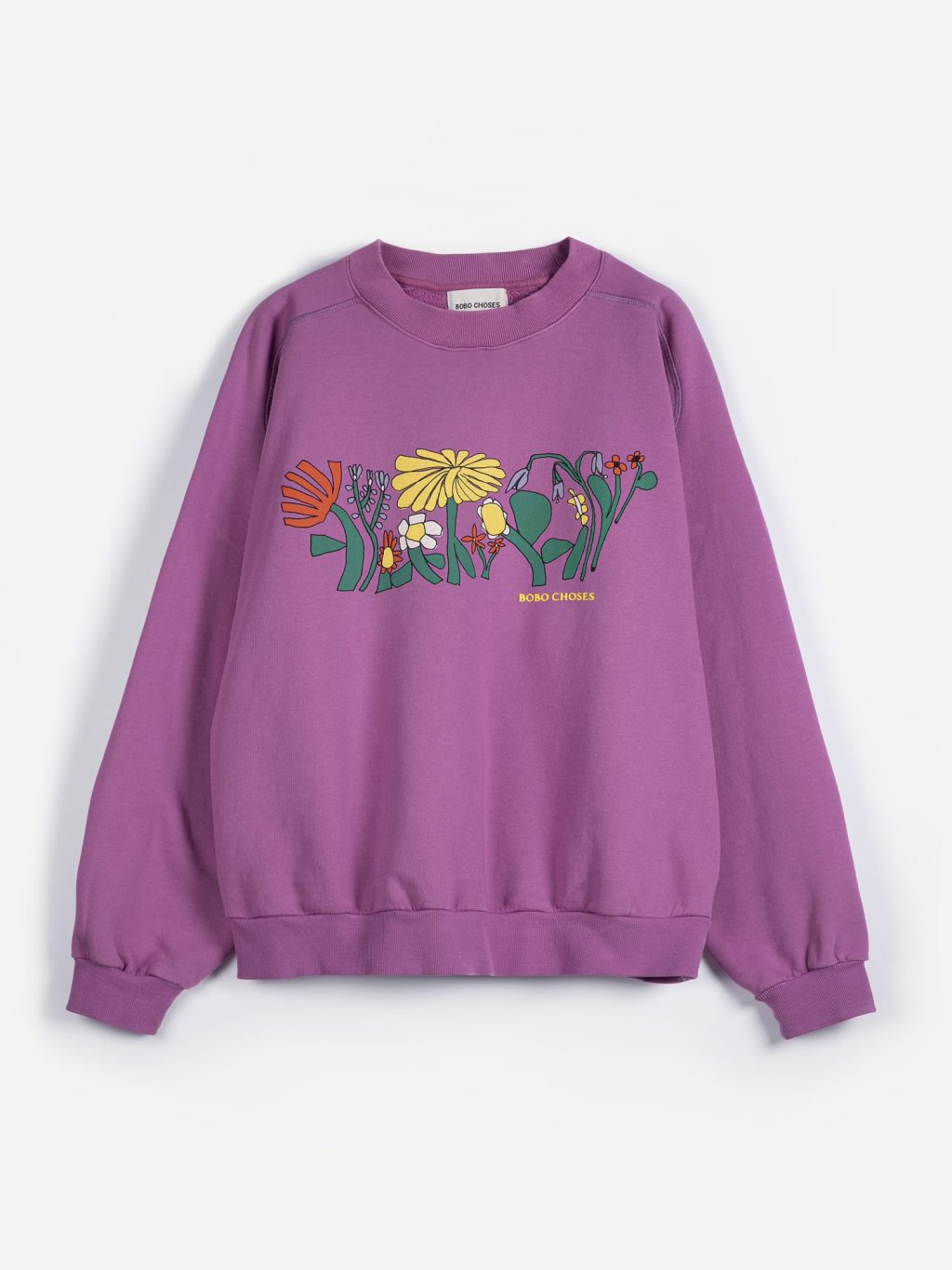 Bobo Choses pohodlná volná mikina v sytě fialové, zdobená autorským "botanickým" potiskem z pokolekce Herbalist. Měkký materiál, raglánové rukávy a klasický crewneck střih z ní dělají ideální kousek na každý den. Ušitá udržitelně v Portugalsku z 100% organické bavlny s certifikací GOTS.