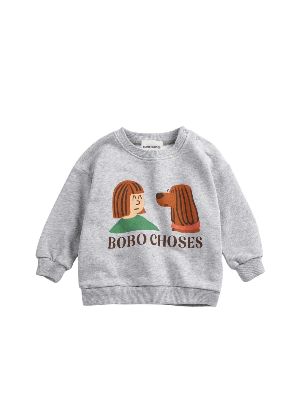 Bobo Choses pohodlná dětská mikina v heather grey odstínu s uvolněným střihem a měkkým vnitřním fleecem, ideální pro každodenní nošení. Dlouhé rukávy se spadlými rameny vytvářejí ležérní siluetu a zapínání na druky na rameni usnadňuje oblékání menším dětem. Vyrobeno udržitelně v Portugalsku.