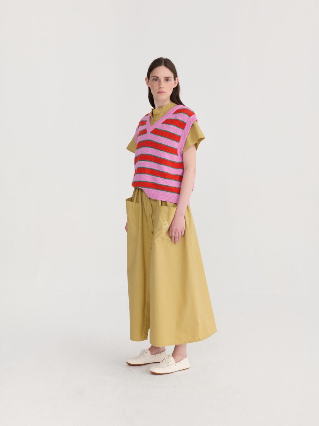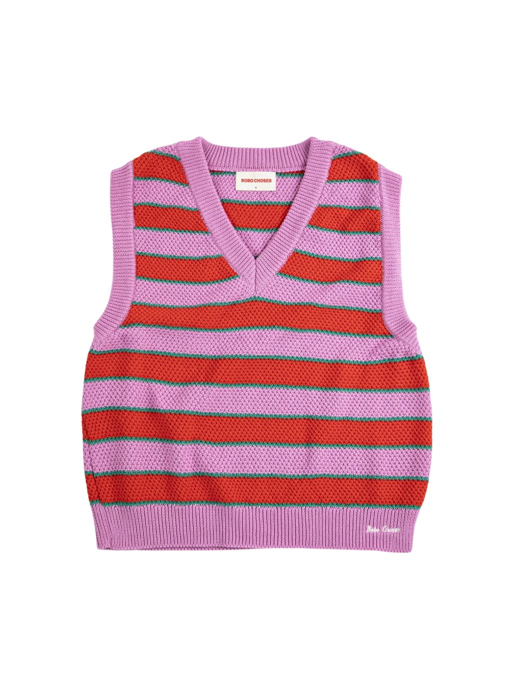 Bobo Choses pruhovaná pletená vesta, který dodá outfitu hravost typickou pro Bobo Choses. Má hlubší výstřih do „V“, jemně volný střih a příjemnou strukturovanou pleteninu, která se krásně nosí na tričku, košili i přímo na těle. Vesta je vyrobena ze 100% organické bavlny s certifikací GOTS. Barevné pruhy v kombinaci růžové, červené a zelené. Vyrobeno ve Španělsku.