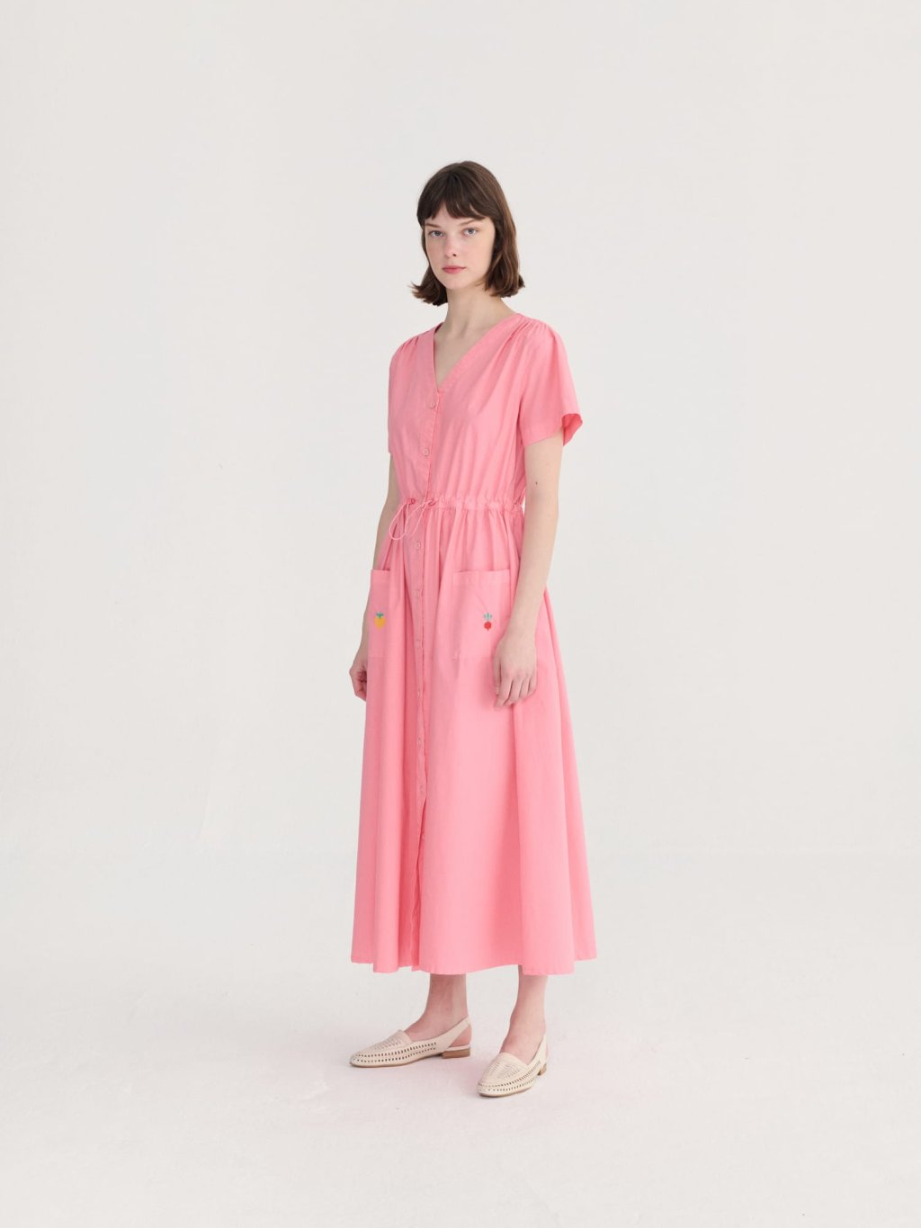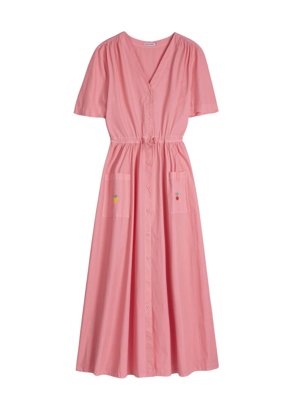 Bobo Choses košilové šaty z jemné 100% organické bavlny s GOTS certifikací. Mají lichotivý výstřih do V, zapínání na knoflíky po celé délce a pružně stažený pas, který krásně zvýrazní siluetu. Praktické kapsy dodávají ležérní nádech, zatímco midi délka působí nadčasově a žensky. Ideální k nošení samostatně i vrstvení – snadno je zkombinujete se sandály, teniskami i vestou.