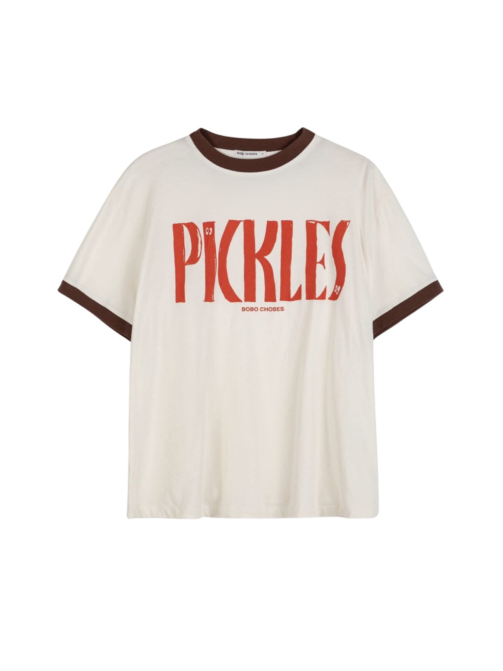 Bobo Choses krémové tričko s kontrastními lemy u výstřihu a rukávů a výrazným potiskem „Pickles“ na přední straně. Model má kulatý výstřih, krátké rukávy a pohodlný, lehce volnější střih, který působí uvolněně a přitom stylově. Vyrobeno ve Španělsku ze 100% organické bavlny s certifikací GOTS. Ideální každodenní kousek s typickou hravostí značky Bobo Choses.