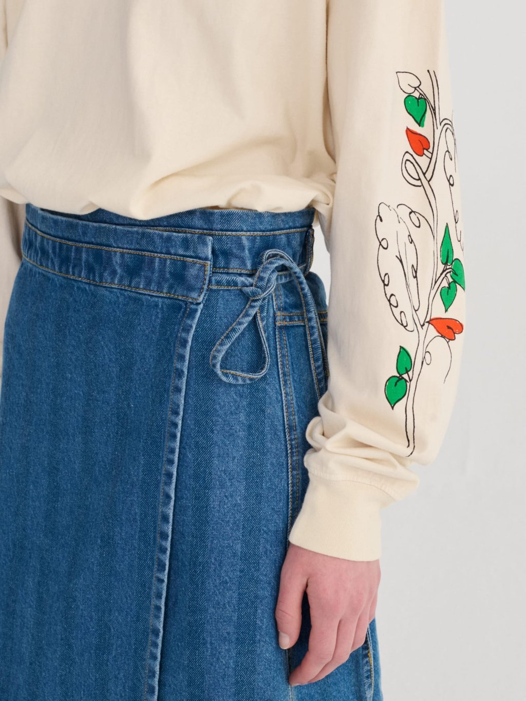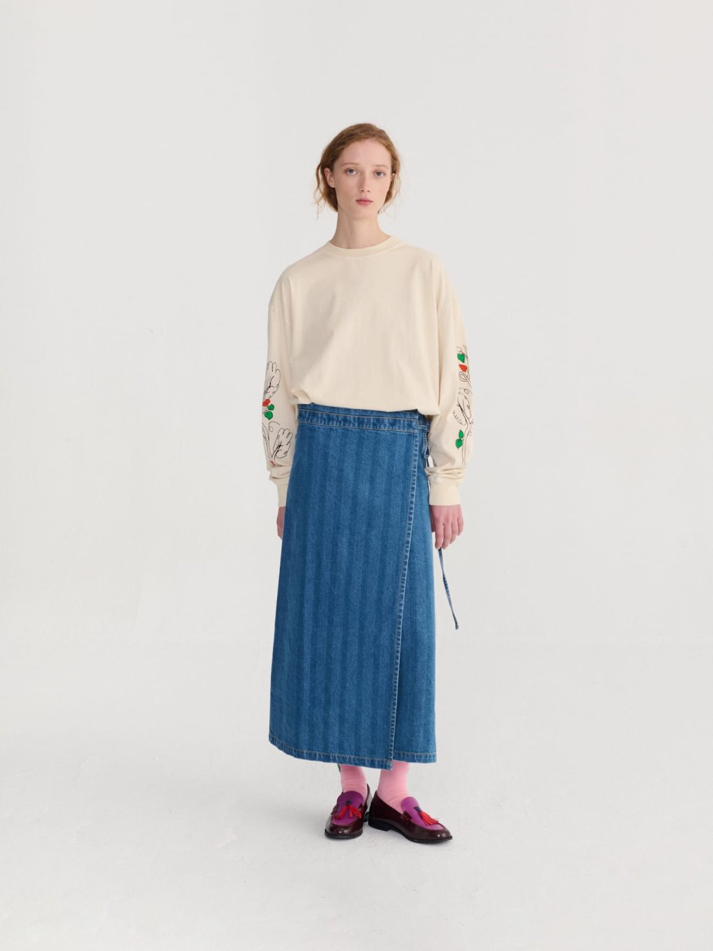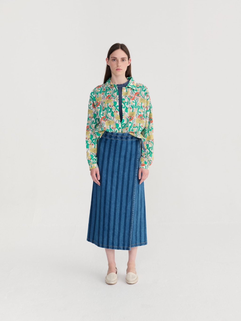 Bobo Choses zavinovací denimová sukně s jemným proužkem. Díky zavinovacímu střihu se krásně přizpůsobí postavě a působí elegantně. Vyrobeno v Portugalsku ze 100% organické bavlny s certifikací GOTS, která zaručuje etickou výrobu i vysokou kvalitu materiálu. Nadčasový kousek, který snadno zkombinujete s jednoduchými topy, košilemi i svetry.