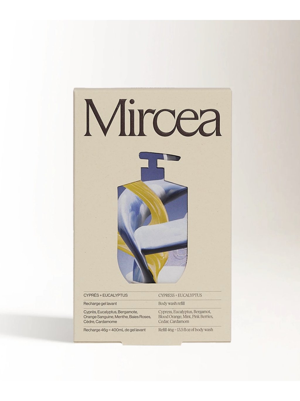 Mircea refill sprchového gelu s vůní cypřiše a eukalyptu. Stačí jen naplnit láhev vodou, nasypat a protřepat. Parfemace s akcentací bohatých a hutných esencí pochází z parfémářského městečka Grasse a je přírodní, pouze z esenciálních olejů. Gel vytvoří hebkou sametovou pěnu, která důkladně myje, ale je taky vyživující vzpruha pro pokožku samotnou. Tóny: cypřiš, eukalyptus, bergamot, červený pomeranč, máta, růžové bobule, cedr a kardamom.