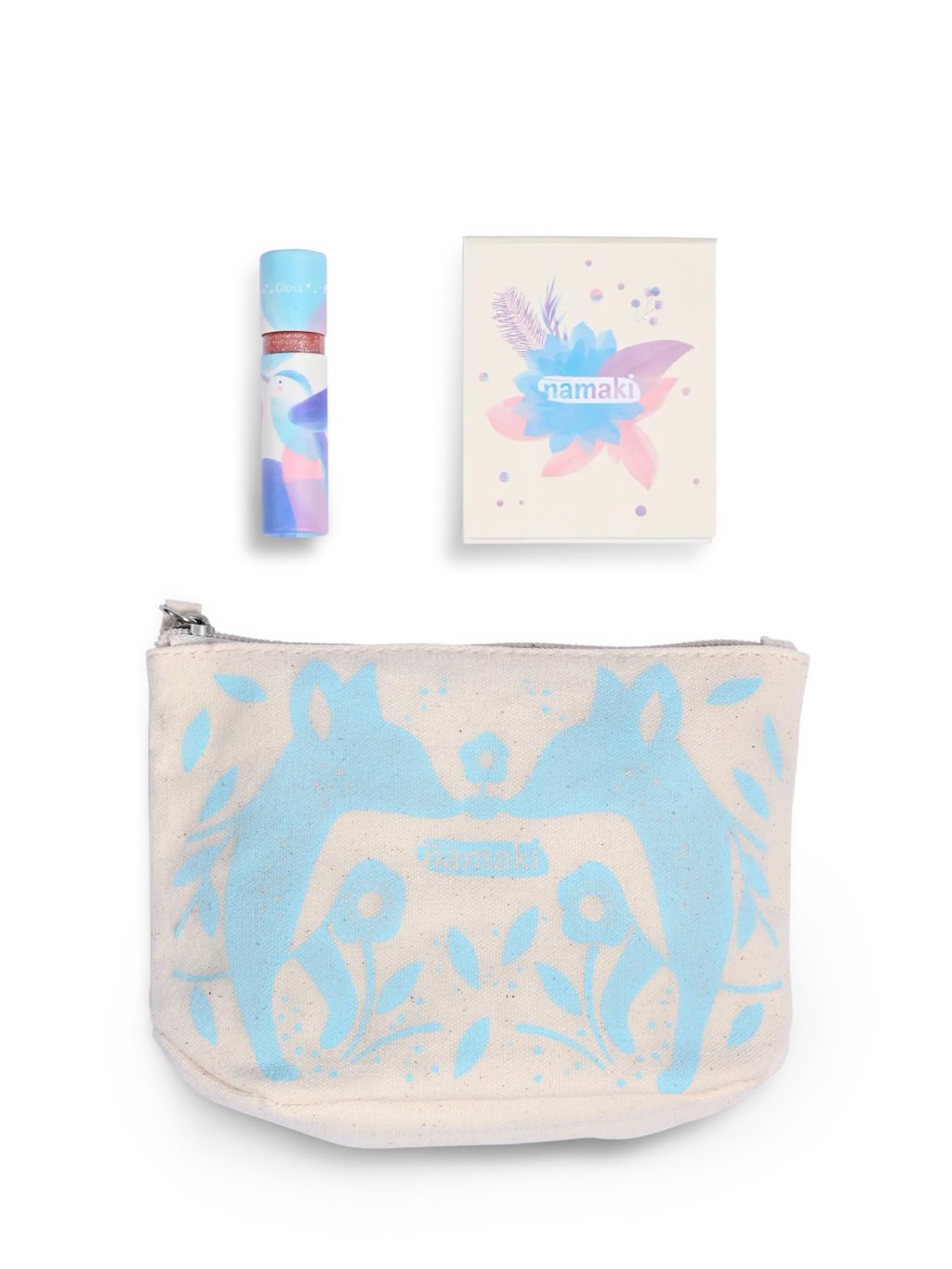 Namaki Blue Fox set obsahuje mix svěžesti a kouzla: paletku tří barevných očních stínů a hydratační růžový třpytivý lesk na rty, oba certifikované jako organické, pro jemnou aplikaci make-upu. Praktický a ekologicky odpovědný – taštička je vyrobena z organické bavlny a zdobena roztomilou sítotiskovou ilustrací. Nápad na dárek, který je stejně krásný jako odpovědný!