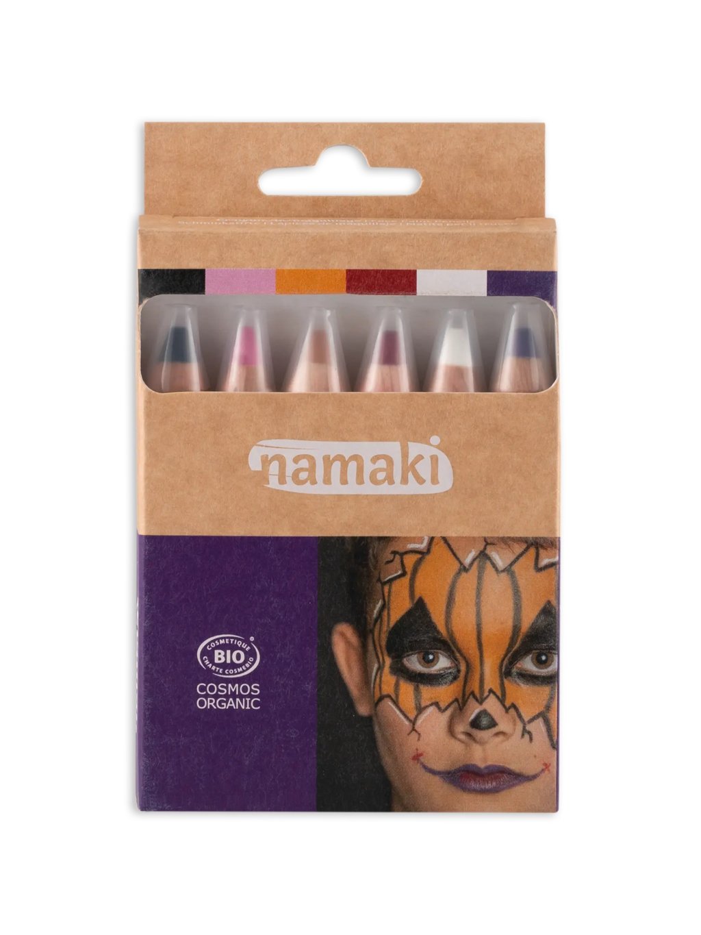 Namaki set World of horrors s 6 tužkami pro strašidelné obrázky na obličej i tělo! Černá, růžová, oranžová, červená, bílá a fialová barva. Snadná aplikace: měkká textura hrotu s organickým kokosovým olejem zaručuje přesné a nerozmazávající se linie. Šetrné ke zdraví: certifikace Cosmos Organic a složení z nejkvalitnějších přírodních ingrediencí. Make-up tužky jsou dermatologicky testované a garantují bezstarostné používání. Bezpečnost: hračky v souladu s normou CE pro naprosto bezpečné použití. Snadné odlíčení pomocí mýdla a vody. Ekologický závazek: ekologicky navržené, recyklovatelné balení.