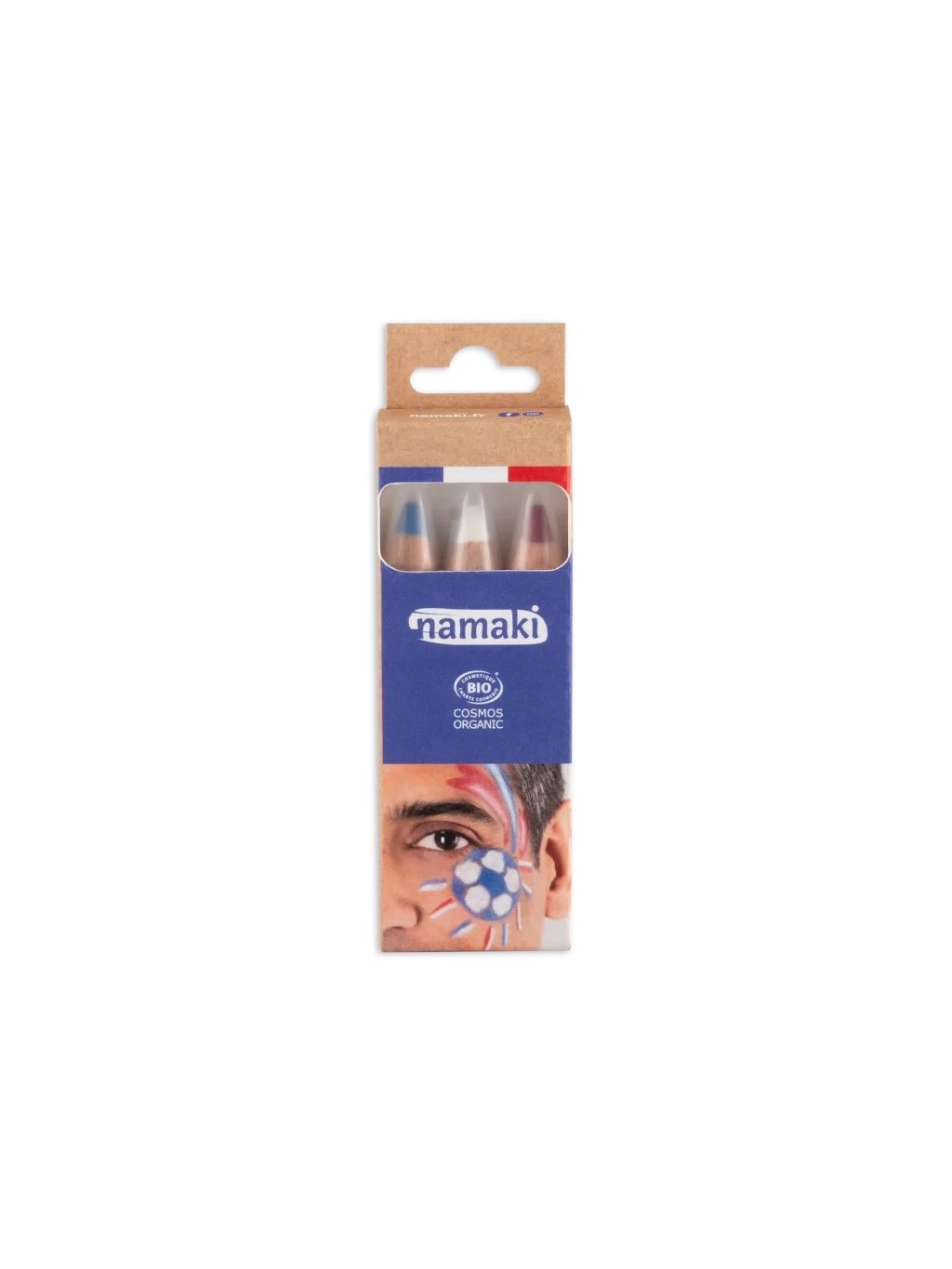 Namaki set tužek - modrá, bílá, červená - ideální pro kreslení české vlajky. Ať už fandíte svému oblíbenému sportovnímu týmu nebo chcete dodat svému dni trikolórový nádech, tyto BIO dětské malovací tužky na obličej jsou připravené udělat z vás toho největšího fanouška. Snadná aplikace: měkká textura hrotu s organickým kokosovým olejem zaručuje přesné, nerozmazávající se linie. Šetrné ke zdraví: certifikace Cosmos Organic a složení z nejkvalitnějších přírodních ingrediencí. Naše make-up tužky jsou dermatologicky testované a garantují bezstarostné používání. Bezpečnost: hračky v souladu s normou CE pro naprosto bezpečné použití. Snadné odlíčení pomocí mýdla a vody. Ekologický závazek: ekologicky navržené, recyklovatelné balení.