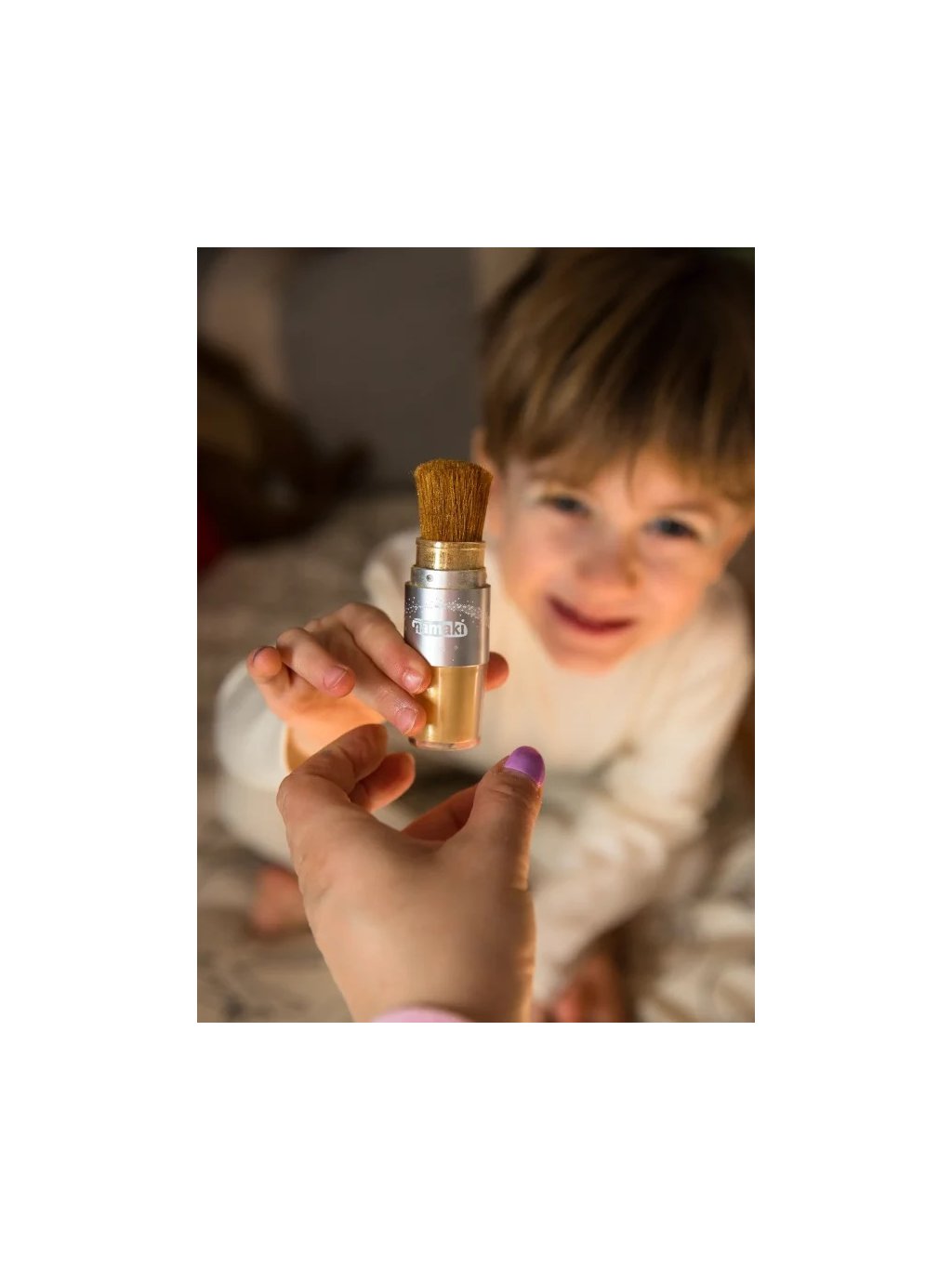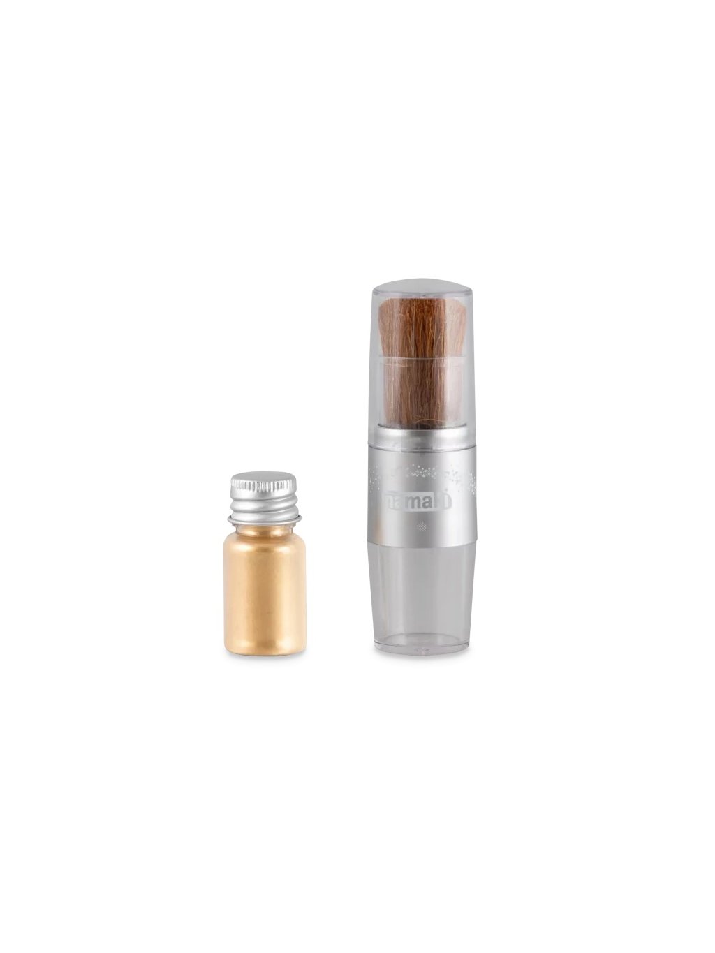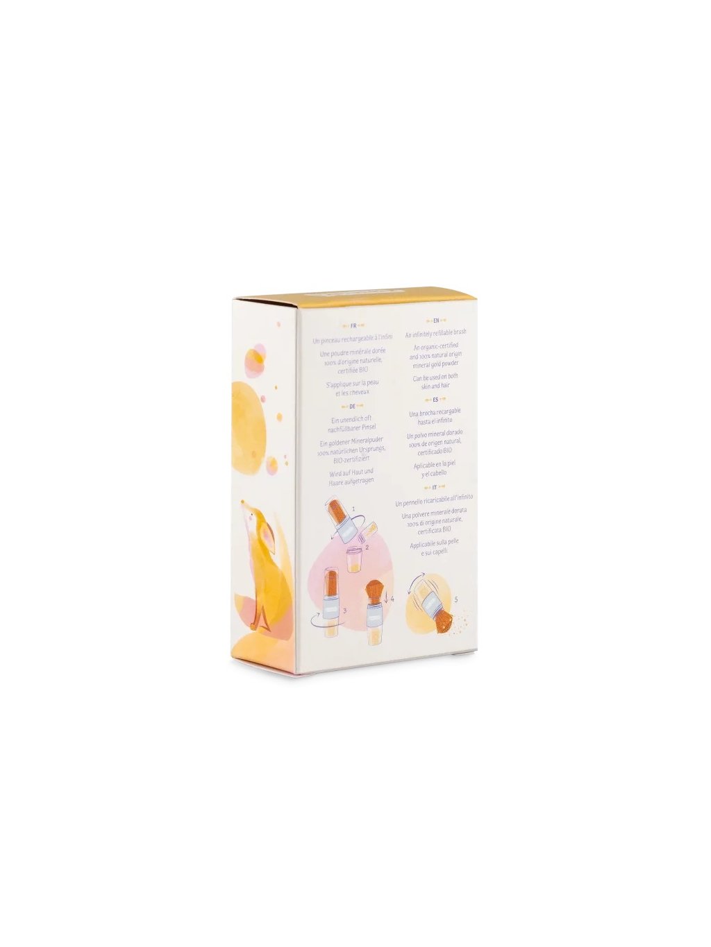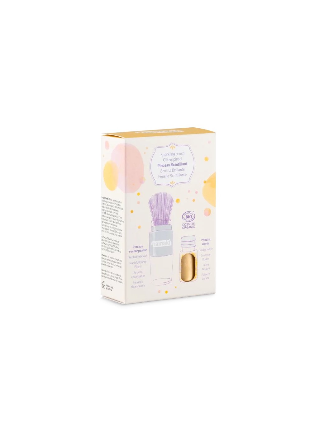 Třpytivý pudr Namaki pro rozjasnění pleti a vlasů ve zlaté barvě. Díky magickému, doplňovatelnému štětci se pudr nanáší tak jemně, jako byste se dotýkali pokožky pohlazením. Jednoduchý dotek na kůži nebo vlasy vytvoří zlatavé odlesky. Ekologický. Třpyt vzniká z přírodních minerálních složek. Snadná aplikace: přírodní štětiny štětce zajišťují jemné a měkké nanášení. Šetrné k pokožce: pudr je 100% přírodní, minerální, dermatologicky testovaný, s certifikací Cosmos Organic – bezpečné použití. Ekologické: štětec je nekonečně doplňovatelný. Bonus: lze aplikovat na kůži i vlasy.