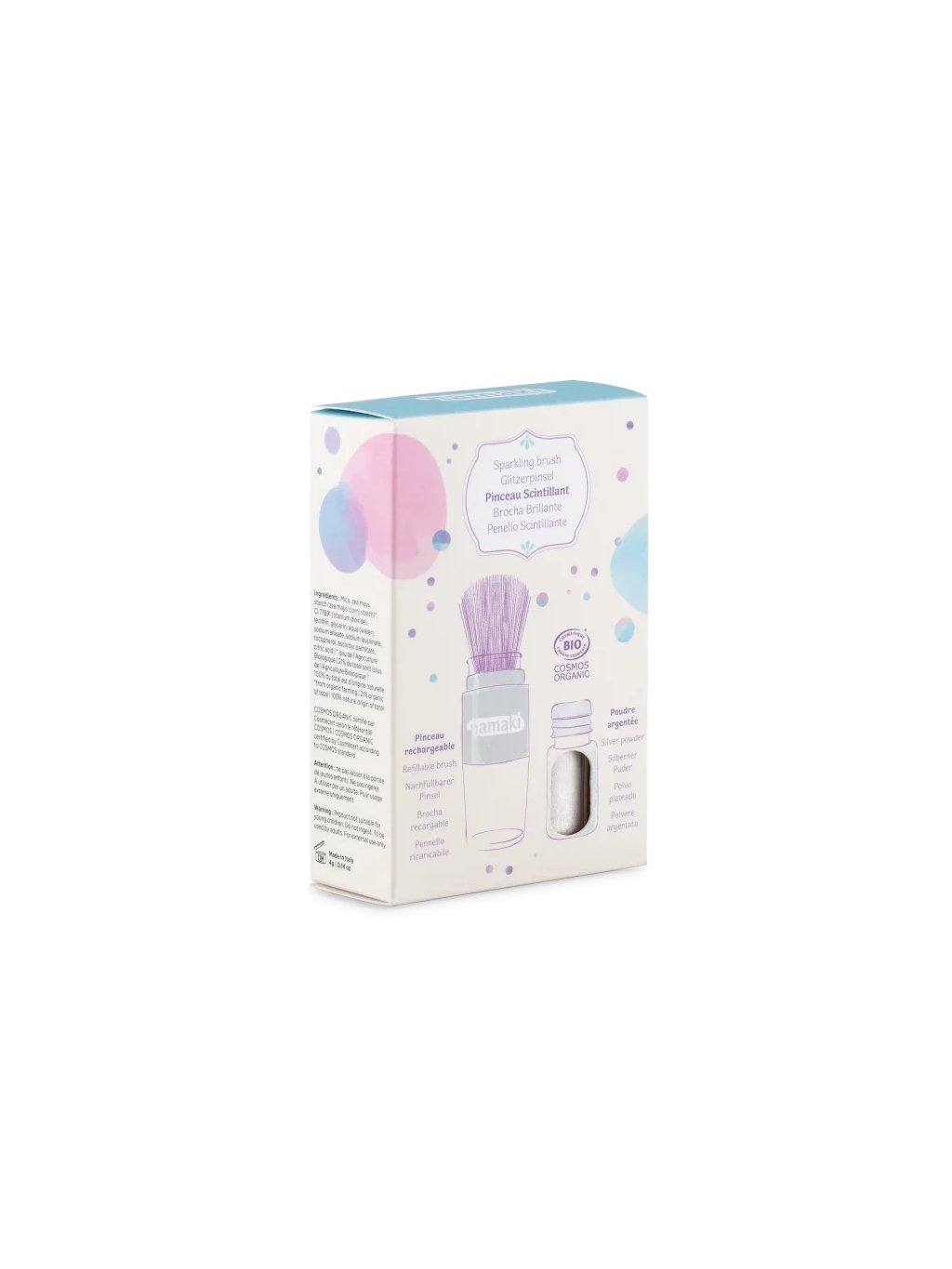 Třpytivý pudr Namaki pro rozjasnění pleti a vlasů ve stříbrné barvě. Díky magickému, doplňovatelnému štětci se pudr nanáší tak jemně, jako byste se dotýkali pokožky pohlazením. Jednoduchý dotek na kůži nebo vlasy vytvoří zlatavé odlesky. Ekologický. Třpyt vzniká z přírodních minerálních složek. Snadná aplikace: přírodní štětiny štětce zajišťují jemné a měkké nanášení. Šetrné k pokožce: pudr je 100% přírodní, minerální, dermatologicky testovaný, s certifikací Cosmos Organic – bezpečné použití. Ekologické: štětec je nekonečně doplňovatelný. Bonus: lze aplikovat na kůži i vlasy.