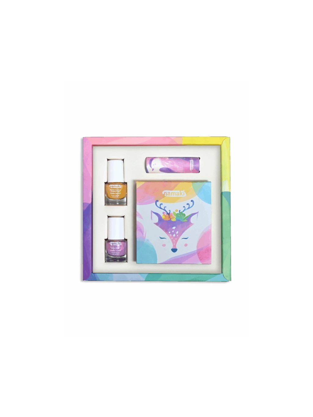 Namaki Sunshine dárková sada inspirovaná pohádkovým královstvím. Vydejte se na snovou cestu za poznáním nejprodávanějších Namaki produktů z řady make-up: paletky se 7 očními stíny, 2 laků na nehty (fialový a zlatý) a malinového balzámu na rty.