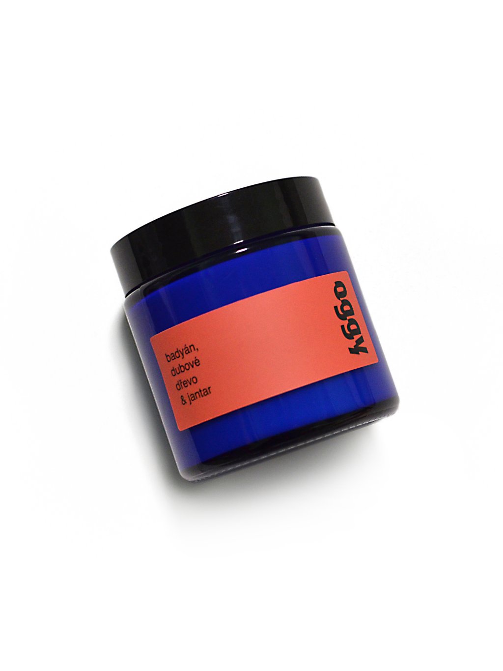 Oggy svíčka v modrém skle BADYÁN, DUBOVÉ DŘEVO, JANTAR 105 g